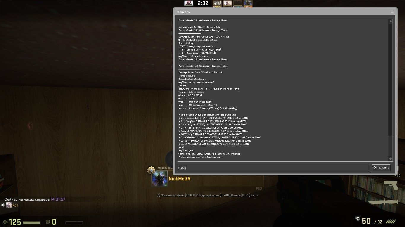 Была такова стори, было 2 трейтора на сервере - Хати и %трейтор_нейм_тут%. Этот %трейтор_нейм_тут% убил детектива, возле него был хати, который втирает что не видел это, но мы же все знаем что звуки в кс для глупых, кот увидел как он его убил, после этого кот убил хати. В след раунде хати киляет кота под предлогом, что у него не достаточно доказательств, что хати т. Почему, когда я делаю как кот, трешер говорит что все нормально, у него были доказательства что вы оба были трейторами. Кстати, я пытался пояснить хати это, сказал 1 раз в конце раунде, он не услышал, я сказал потом еще 1 раз в след раунде, он услышал но говорит что я не прав, когда я начал уже объяснять это, он выключил мне микрофон. Пояснить плез ему, что так нельзя делать.