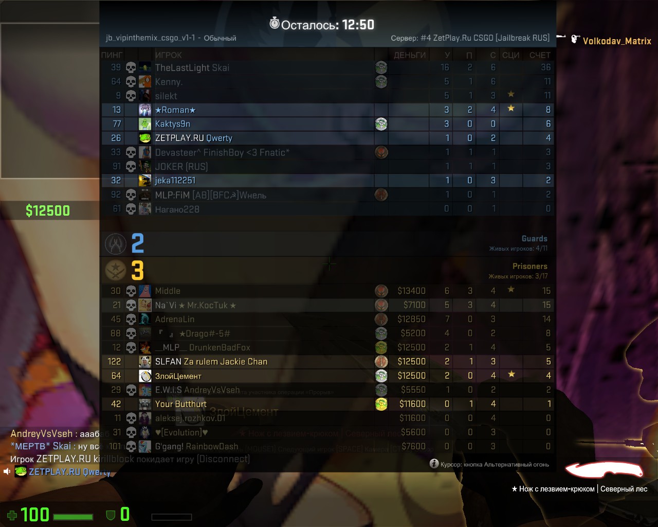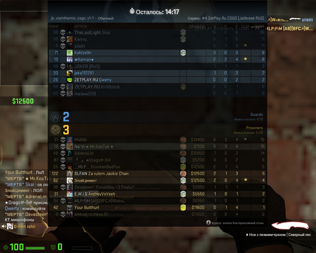 Моя любимая игра это "накорми КТ".Сегодня я играл в нее,а те кто отказывались,я вел на любую игру на карте.Так же делал и данный админ со мной.Так вот,уже сегодня,вечером другой админ Doctor сказал,чтобы я так больше не делал.Он может потвердить.Я больше так не стал делать.Так вот,прошел примерно час.Новая карта.Осталось 5 Т,я сказал,играем в "накорми КТ",отказы раз,два,три...Были отказы,но я их никуда не повел.И тут этот админ ("O-Ren Ishii" STEAM_1:1:72492934 ) дает мне 240 КТ бан,как он объяснил,по причине того,что его задолбало,что я намеренно убиваю тех кто мне не нравятся,отводя на различные игры.Он может это потвердить,что он это говорил.Ну а я не убиваю тех кто мне не нравиться,я просто отводил на другие игры тех,кто отказывался.Но после слов Doctora,я перестал это делать.