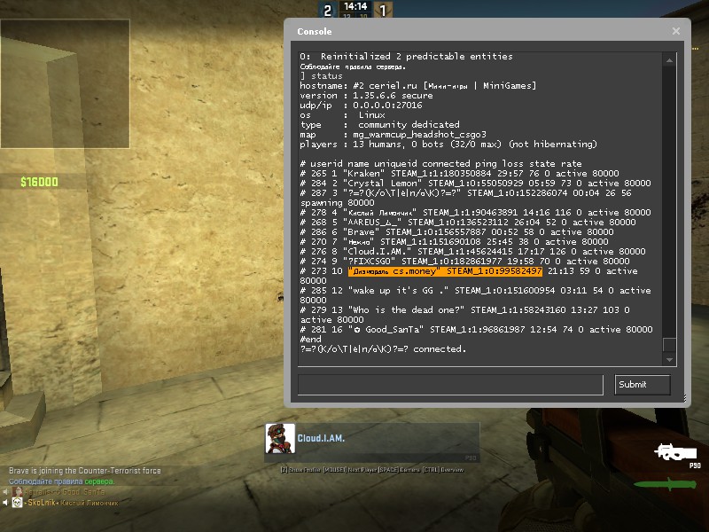 Зарегистрирован: 17:39:01, 1 окт 2014 Сообщения: 295 Игровой ник: Kenny Steam_ID: STEAM_1:1:64447993 |