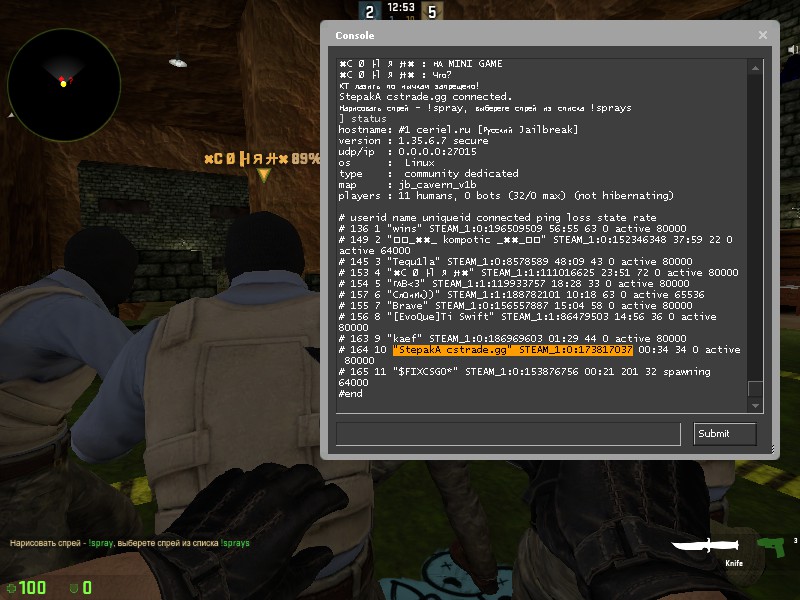 Заголовок сообщения: "StepakA cstrade.gg" STEAM_1:0:173817037