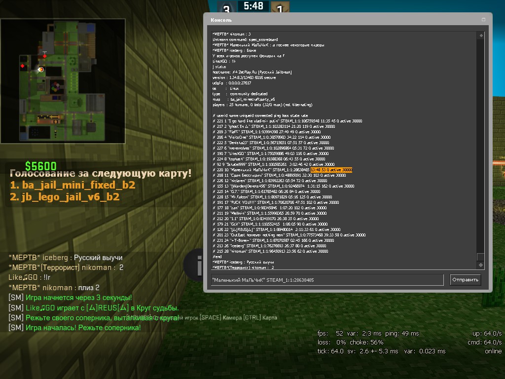 L 05/08/2015 - 16:04:52: "Like♫GO<190><STEAM_1:1:75059886><TERRORIST>" say "играем в накорми кт"