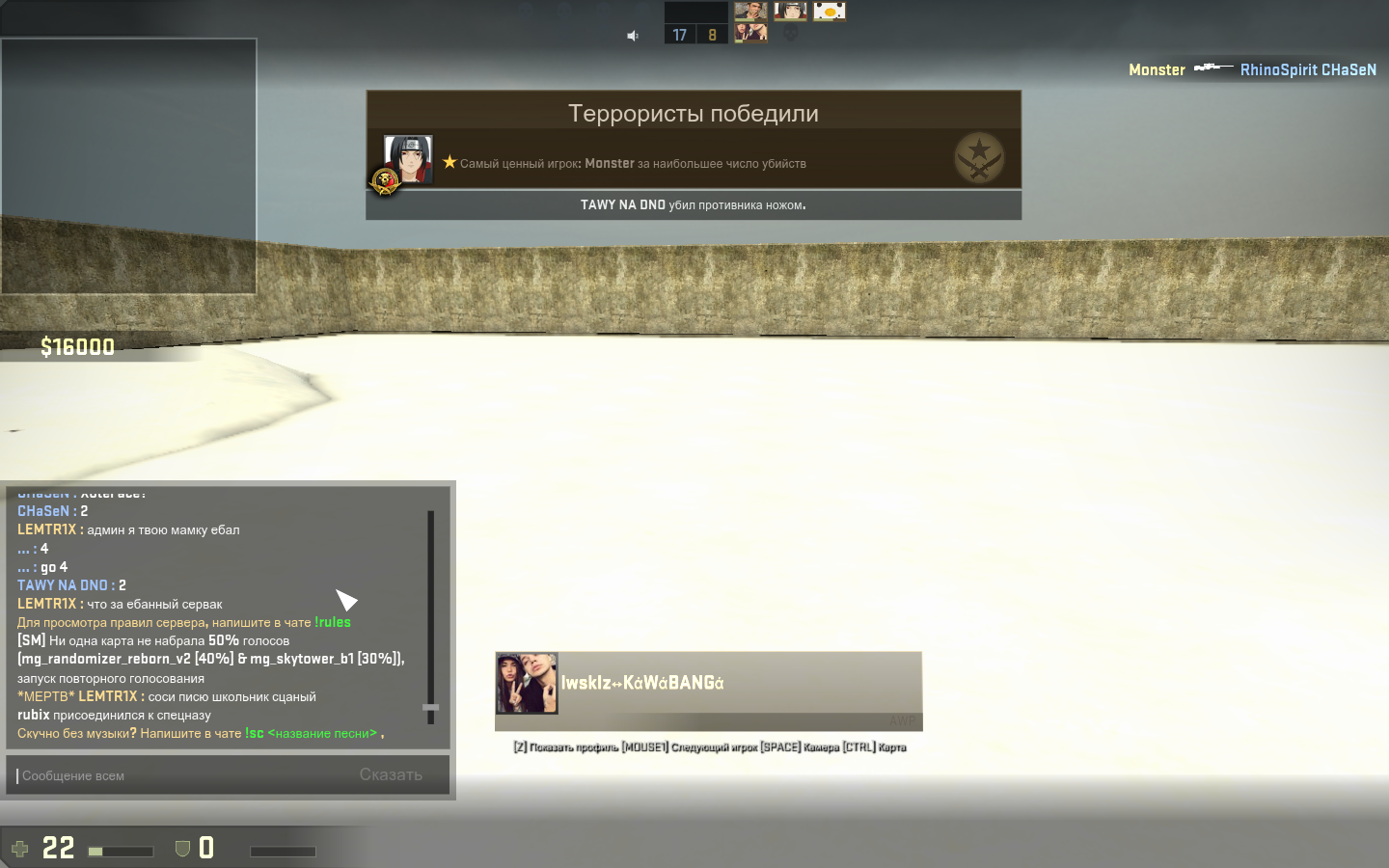 Зарегистрирован: 23:20:41, 17 фев 2017 Сообщения: 44 Игровой ник: drakosha Steam_ID: STEAM_1:1:63812406 |