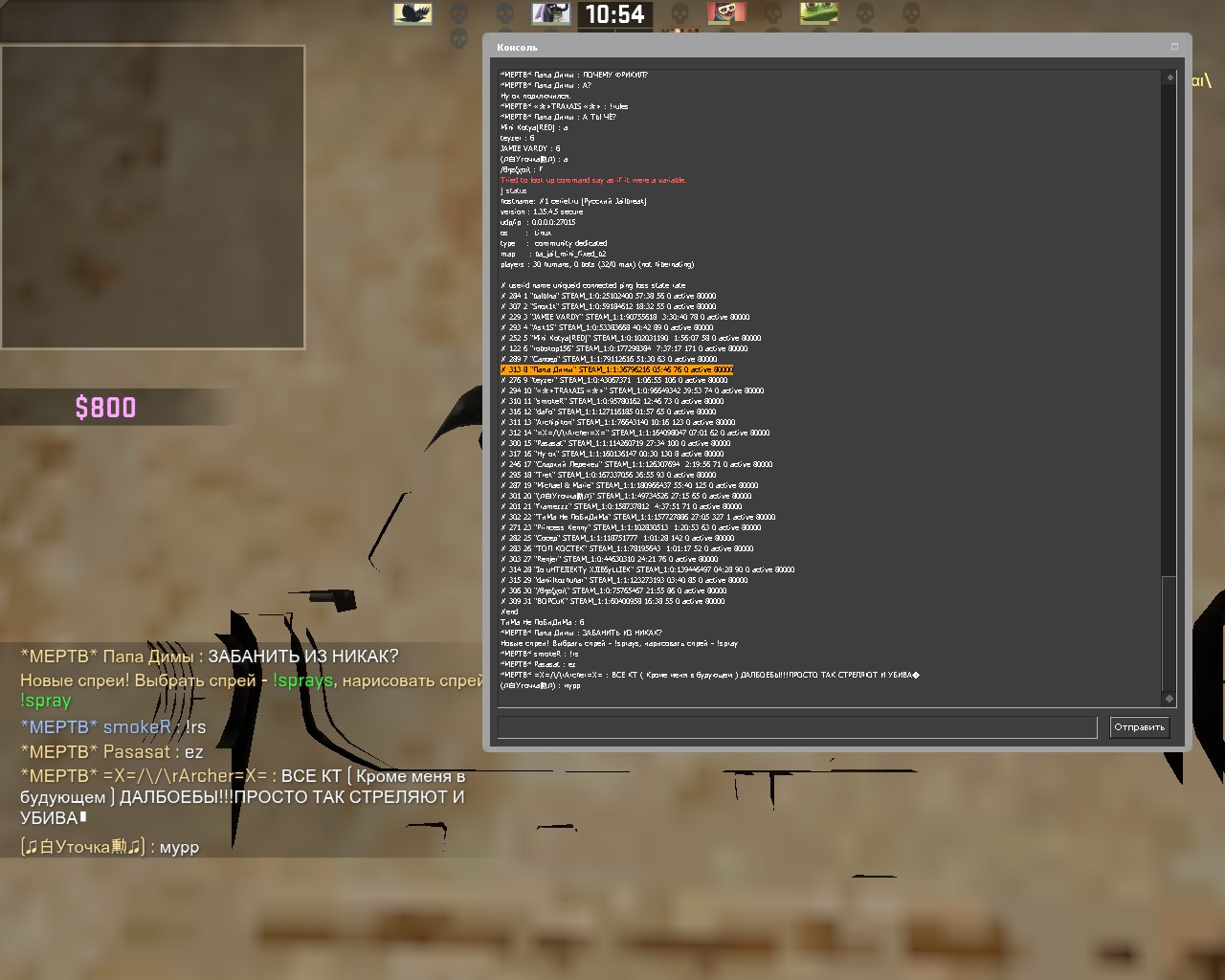 # 313 8 "Папа Димы" STEAM_1:1:36796216 05:46 76 0 active 80000